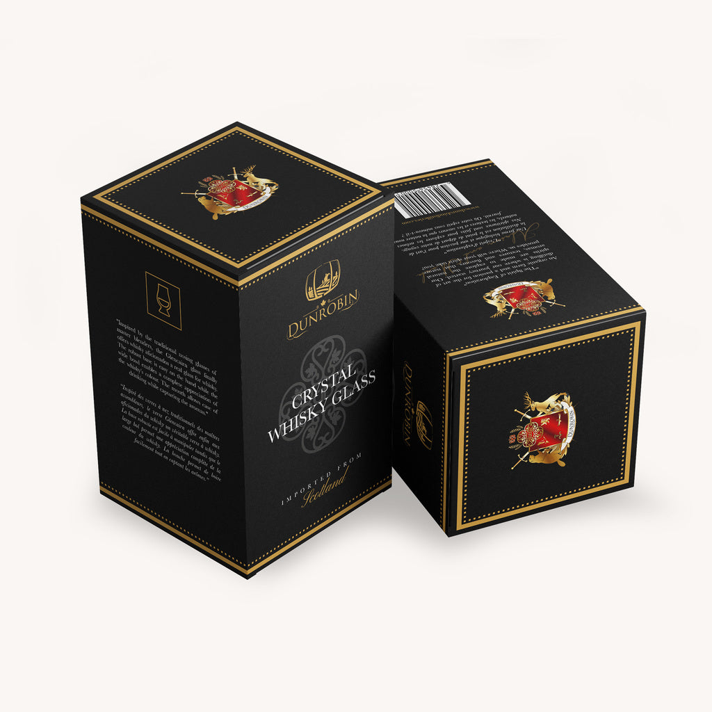 Each Dunrobin branded crystal glass has its own design, one with our barrel logo and the other our coat of arms. Both also come in their own beautiful box, providing information about the glass and Dunrobin Distilleries.